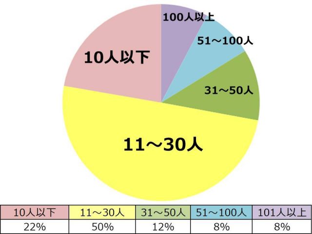 34人の平均人数は果たしてどんな意味を持った数字でしょうか。規模ごとにどの程度占めているのか内訳を調べてみましたのが下記の円グラフです。