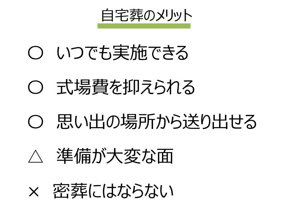 小規模な家族葬が最近増えている中で、なかでも10人未満の近しい家族だけで送るお葬式も増えていますが、そうしたなかで人数が少ないなら昔のように「家」でお別れする選択も見直されています。式場にない良さとして、まずは時間的な制約がないのでいつでも行えることが挙げられます。冬場など式場によっては1週間近く予約が取れないケースもありますが、自宅であれば準備が整えばいつでも行えます。式場の費用も民間では20~30万円程度(公営でも10万円程度)の式場費用がかかることが多いですが、その点を抑えることができるのも見逃せません。多くの親戚、友人を招く場合には準備がとても大変というデメリットが出てきてしまいますが、家族だけならそれほど気を遣うこともないかもしれません。ただ自宅に花や棺が届いたり、出入りがどうしてもあるので近所の方に知られてしまうことはケアしなければなりません。完全な密葬ということはできませんので、隣近所の方には事前にご挨拶する必要はでてきます。メリット、デメリットが多く共存する形式ですが「それでも最後は住み慣れた自宅から送り出してあげたい」という気持ちがある場合には、自宅から送り出す家族の貴重な思い出にもなりますのでお勧めさせていただいています。