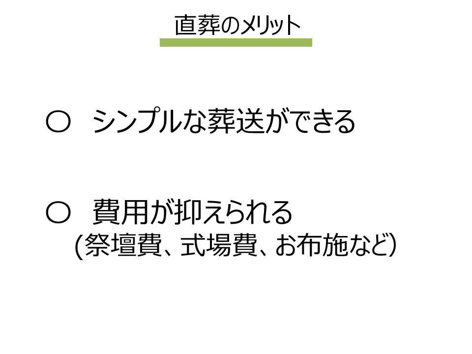 シンプルな1日葬を紹介しましたが、それでももっとシンプルに直葬でいい方はやはり宗教的な部分の考え方の違いかと思います。お経などの儀式は一切不要で家族の手でお見送りさえできれば十分というはっきりとしたお考えの方が選択されています。この点、シンプルにすることに対して多少の迷いがある場合には「1日葬」という形式もおすすめしています。人数の面でも基本的に10人以内で執り行われることが多く、多くの親戚が集う場合にはやはり親族同士が落ち着いてご挨拶出来たりする場、時間が取れる無宗教形式の家族葬、1日葬が向いていますので、慎重に形式を選ぶことをお勧めします。費用の点では直葬は祭壇、式場費、お布施などがかからないため、この点では最も費用を抑えることができます。
