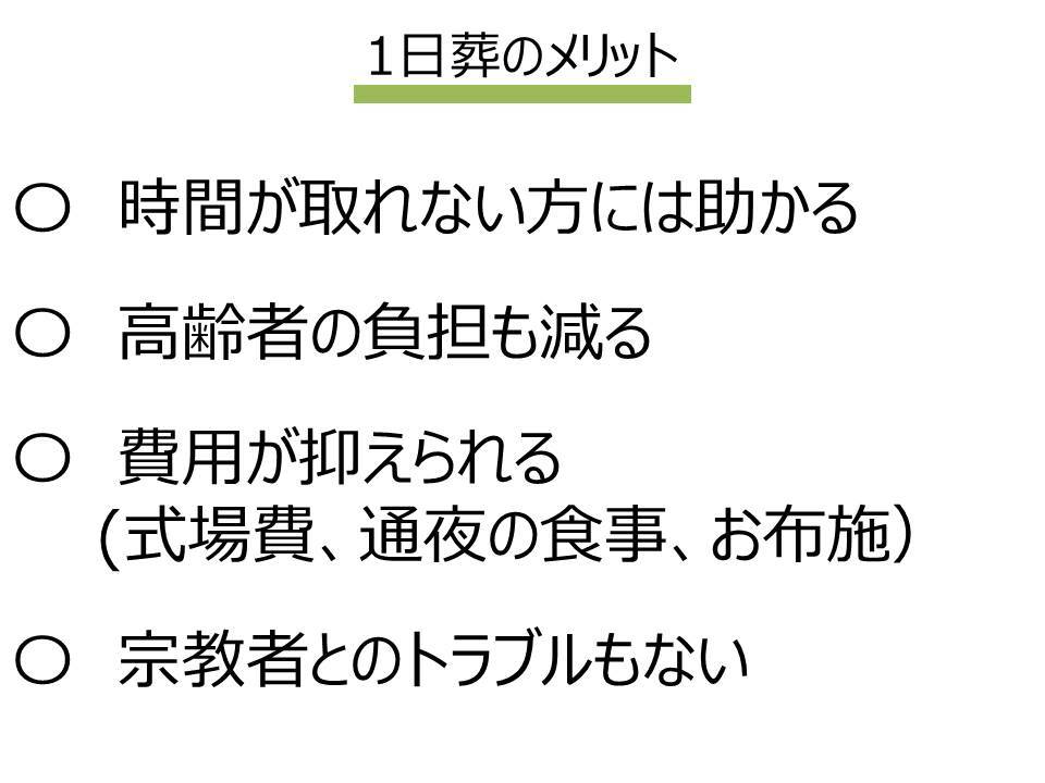 また1日葬は費用の点でも大きなメリットをもたらします。式場の費用、通夜の食事、お布施は1日分だけになることで抑えられるケースが多くなります。