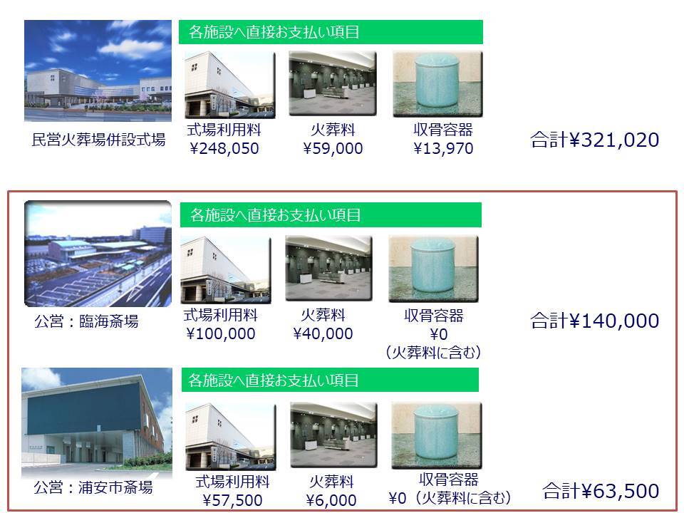 こちら一番上の民間の火葬場併設式場の場合の式場費、火葬料、収骨容器の費用で比較したものになります。都内の比較でも半額以下になるのが公営斎場です。意外と見落としがちですが、収骨容器は公営斎場では火葬料の中に含まれて無料になる所もあります。千葉県の浦安市斎場などでは、こうしてみると都内の民営式場と比較すると5倍くらいの開きがでてきます。