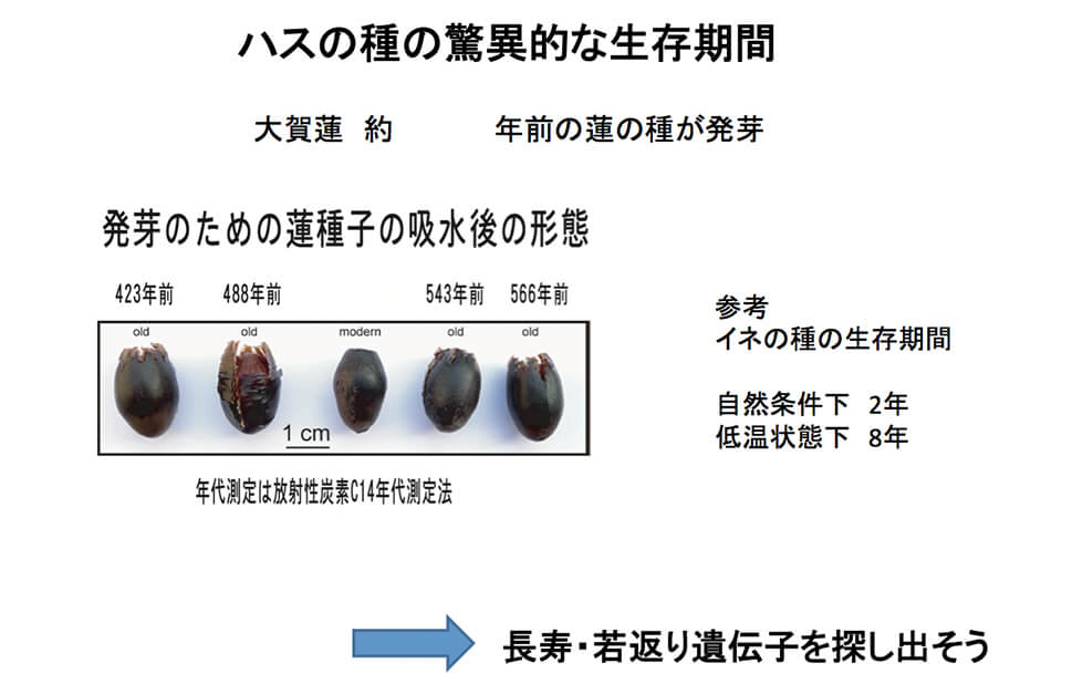 蓮には強い生命力があり、蓮の種は2000年間も生き続けられると言われています。その強い生命力から「蓮には長寿と若返りの秘密があるのでは?」と、科学者の間では蓮の遺伝子研究が現在も進められています。もしかしたら、近い将来、蓮から長寿や若返りのヒントが見つかるかもしれません。