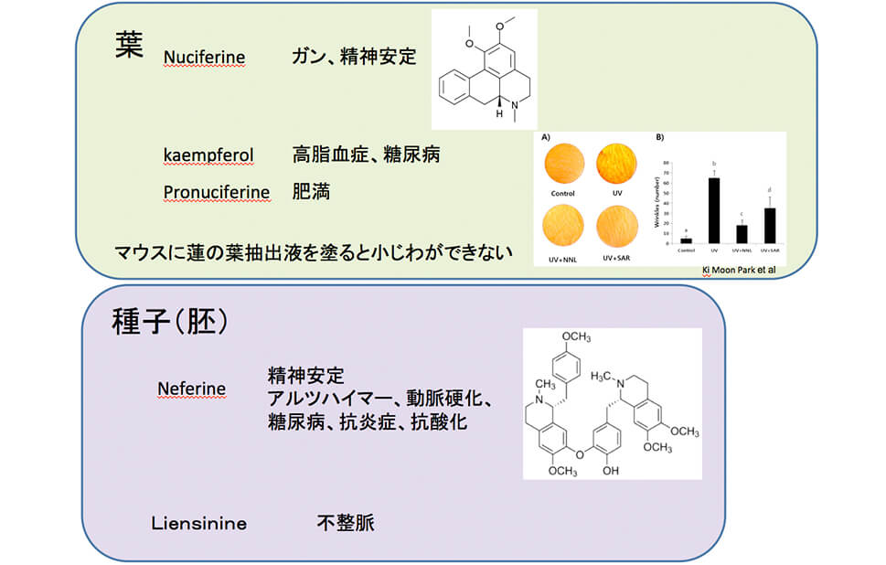 そのように生命力が強い蓮の実は、古くから滋養強壮の漢方薬としても用いられています。蓮の実の味や食感は栗に似ています。若い蓮の実は、生のまま食べることもでき、ほのかな甘さを感じられます。ご飯と一緒に炊いた蓮の実ご飯や、スイーツとして甘露煮にしても美味しくいただくことができます。蓮の葉はお茶として販売されています。凝った調理の必要もなく、手軽に美味しく食事に取り入れることができます。蓮の実には下痢や食欲不振を治す働きや気持ちを鎮める働きがあり、不眠や動悸にも良いとされています。蓮の葉にはガン・精神安定・高脂血症・糖尿病・肥満に良いとされ、中国では「美人のお茶」として蓮の葉のお茶が飲まれています。種子(胚)には、精神安定・アルツハイマー・動脈硬化・糖尿病・抗炎症・抗酸化・不整脈に効果があるとされています。このように、蓮には健康を維持するために、多くの薬効があることがわかります。