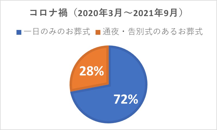 コロナ禍において圧倒的に割合が変わったのが、コロナ前では、家族葬でも半数以上が行っていた「通夜・告別式」でのスタイルがコロナ禍においては、7割以上が告別式のみの「一日葬」になったことです。会場内の会食が制限、時期によっては禁止されており、通夜振る舞いができないことに加え、会場外でも夜間はお食事を取る場所も営業していなかったりなどで、十分なおもてなしができないということがひとつの要因です。また、お寺によっては、通夜・告別式両方を行うことが必要という考えもコロナ以前にはありましたが、コロナ禍においてはその実現が難しいことから一日だけでよい、という考えが一般化されたということもあります。