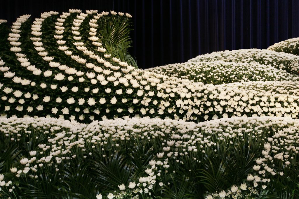 また、白菊の技術力を競うように、グラデーションを持たせた祭壇や、菊の花で線を描くライン祭壇など、新しいデザインが生まれてきました。高度経済成長からバブルにかけて、葬儀も他の分野と同じく、より大きく、華やかにという方向になっていきました。