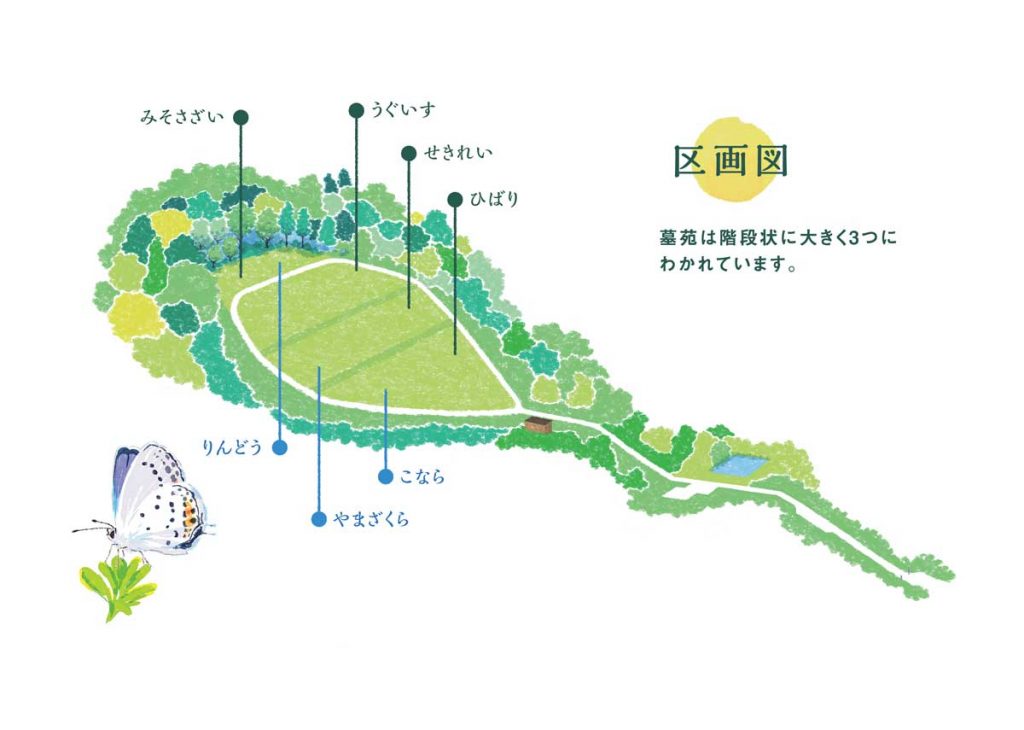 自然を再生するためのお墓であり、将来的には墓苑全体が自然の森になる設計で運営をしている樹木葬墓地です。合葬墓と個別墓、それぞれの区画と料金プランがあります。自然の森に戻すことを目的としているため、合祀したり、区画を再販、再開発することはなく、将来「自然の森」として守られ続けます。